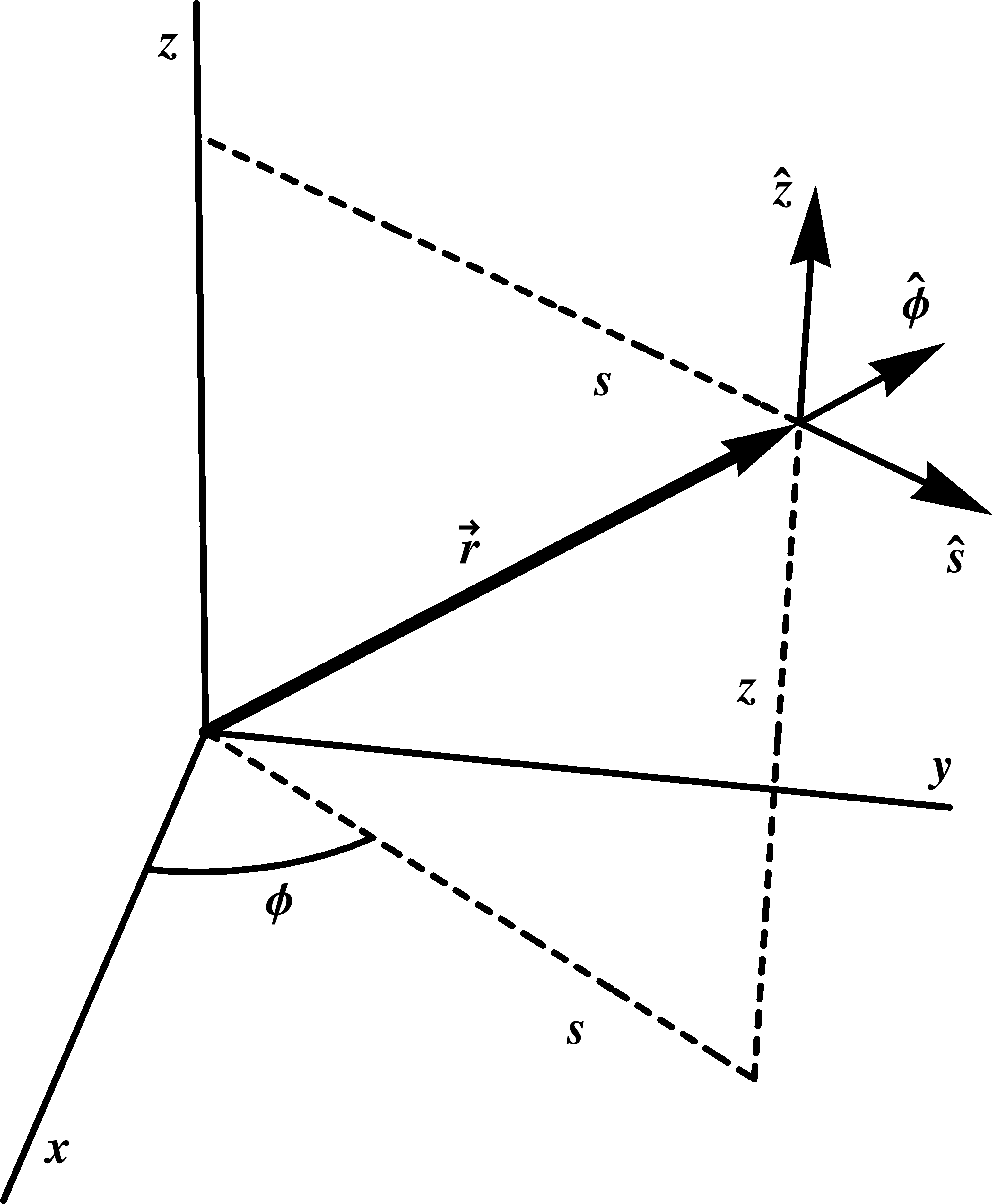 • \(\left\{\hat{s},\hat{\phi},\hat{z}\right\}\) in cylindrical coordinates.