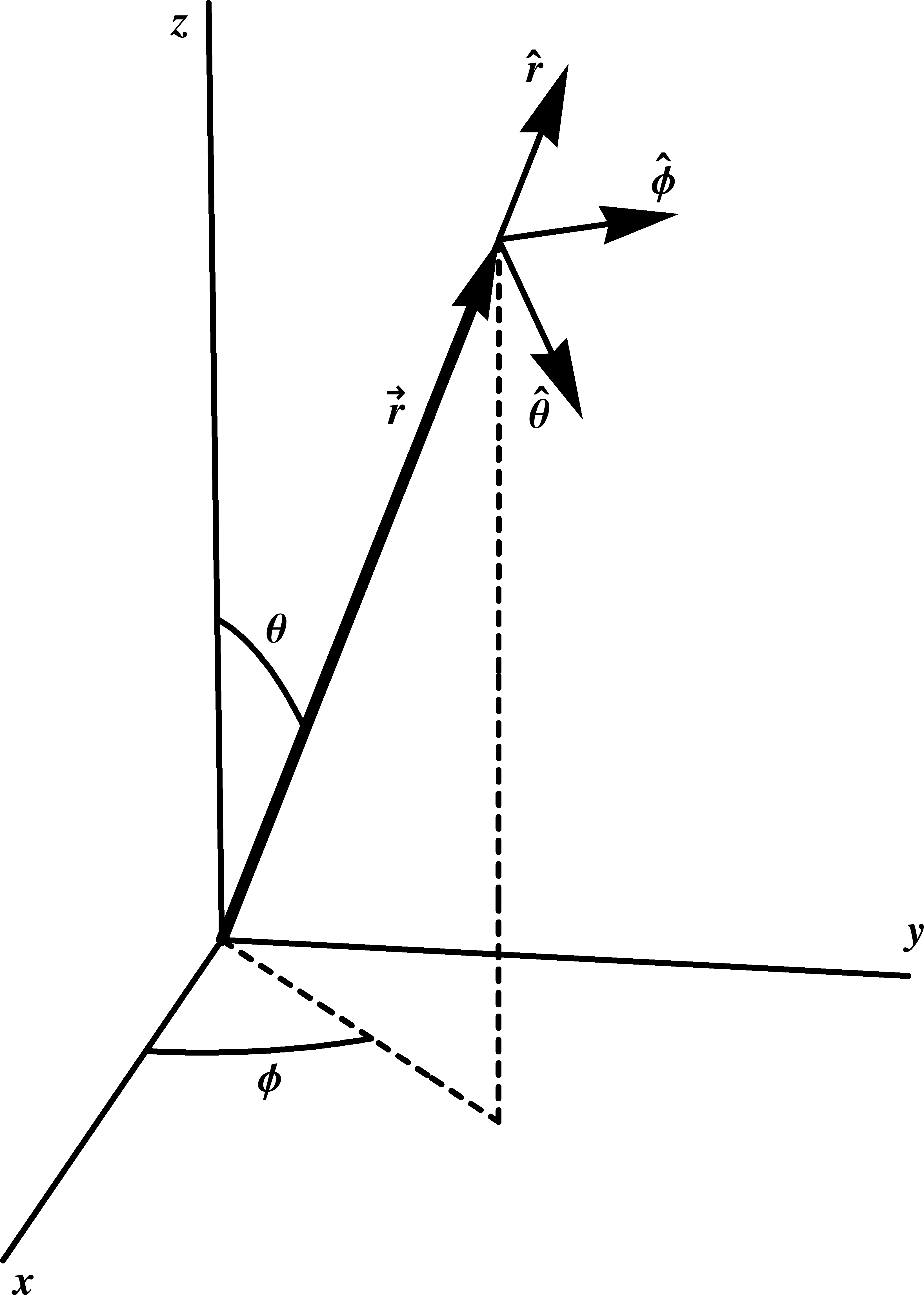 • \(\left\{\hat{r},\hat{\theta},\hat{\phi}\right\}\) in spherical coordinates.