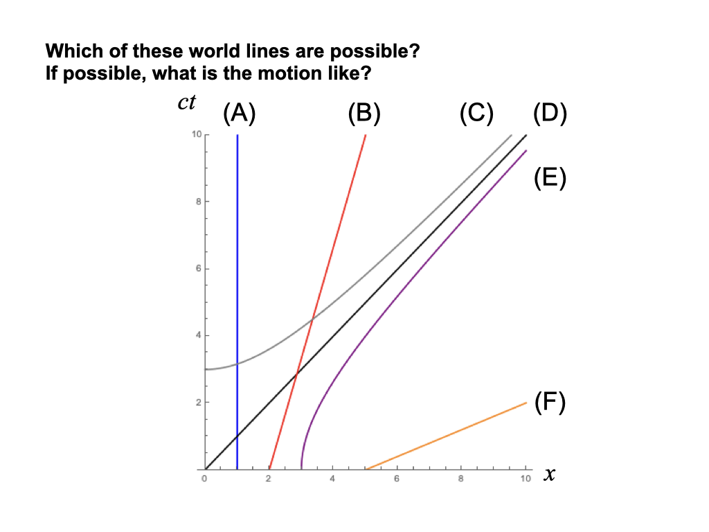 Student consider several curves on a spacetime diagram and have to judge which curves could be worldlines for an object.