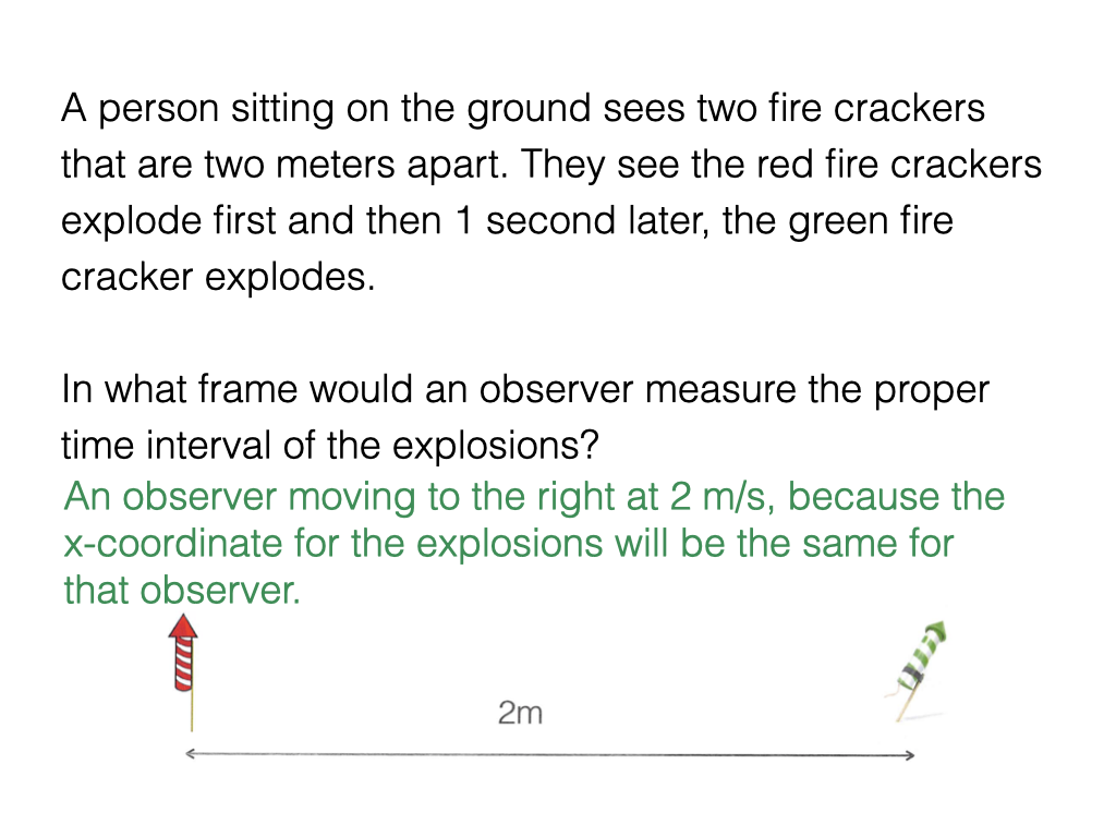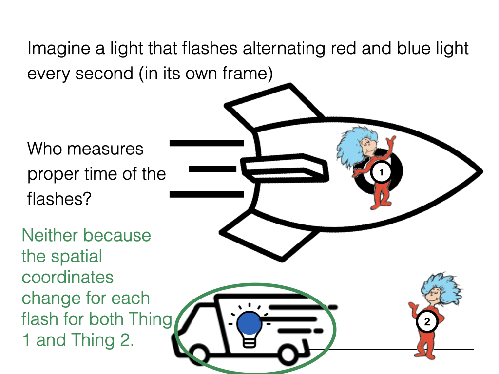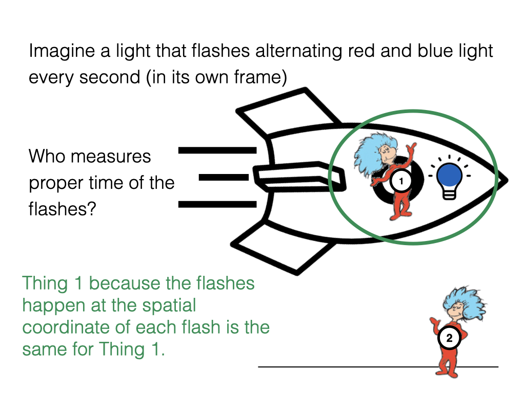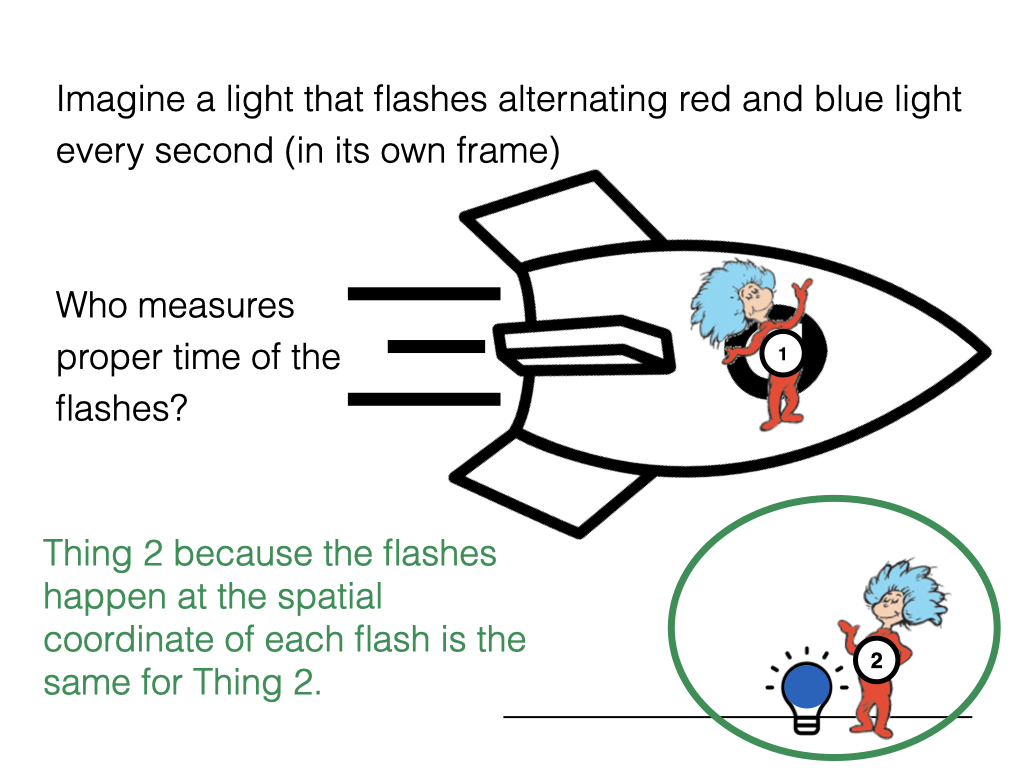 - Proper time is measured by the observer for whom the events are all at the same spatial coordinate (colocated)