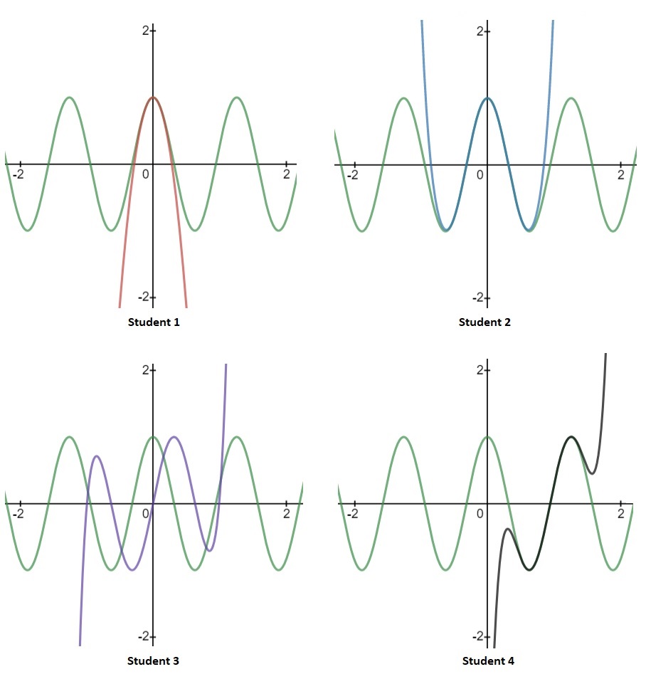 Four students attempted to find a Power Series approximation for \(\cos(5x)\) (graphed in green on all plots), in a few sentences, qualitatively describe what each student did differently and for what range of \(x\) values does their approximation seem valid.
