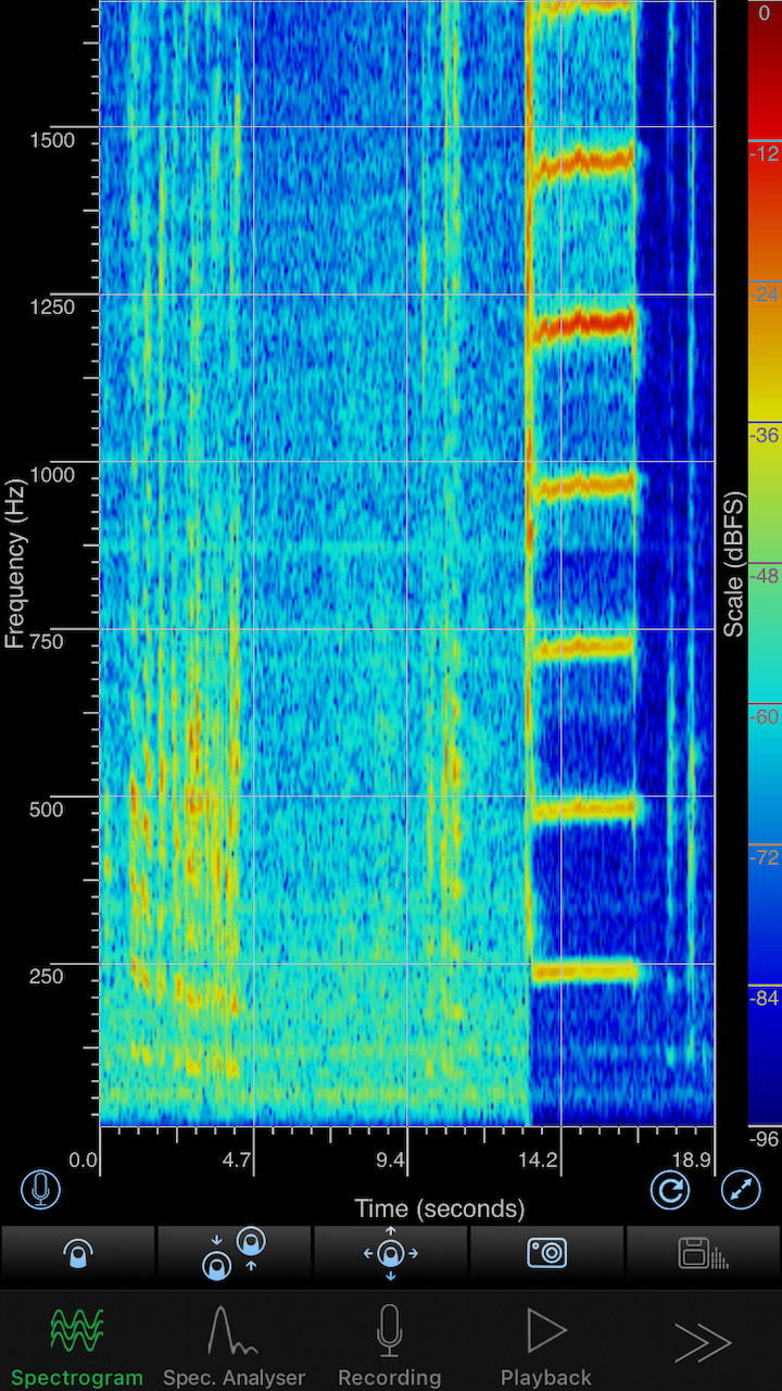 The spectrogram shown below was recorded when I played a note on the bugle. This note is a superposition of the bugle's 2nd resonance (240 Hz), the 4th resonance (480 Hz), the 6th resonance (720 Hz) and so forth. Other resonances were not excited when I played this note. (Other resonances could be excited if I played a different note). I am using a standard convention of numbering the lowest resonant frequency as #1, the next highest resonant frequency as #2, and so forth.