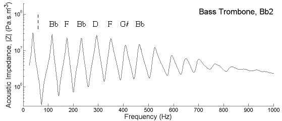 Figure 1: Approximate pressure distribution for the first four modes in a trumpet. Note that the “turning point” moves outward in the bell as the frequency increases. Mode frequencies are nearly in the ratios 0.8 : 2 : 3 : 4.Figure 2: The resonant modes of a brass instrument can be determined by finding the peaks in the acoustic impendance.
