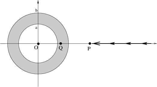 \(Q\) a distance \(d\) (where \(a<d<b\)) from the center of the shell.