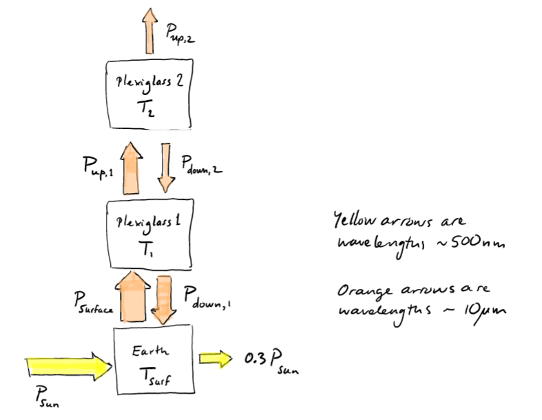 Now solve for \(T_1\) by looking at Plexi 2: \begin{align} P_{\text{up,}1} &= P_{\text{down,}2} + P_{\text{up,}2}\\ \sigma T_1^4\ 4 \pi R_{\text{earth}}^2 &= 2 \sigma T_2^4\ 4 \pi R_{\text{earth}}^2\\ T_1 &= 2^{1/4} T_2\\ &=(1.19)(255\text{ K})\\ &= 303\text{ K} \end{align}