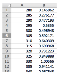 Download the file extraterr_solar.csv, which is in comma-separated-variable (csv) format. Open the csv file in a spreadsheet program such as Excel. The data is the spectral intensity with respect to wavelength, \(S_\lambda\), for the sunlight that is hitting a satellite above the earth. The first column is wavelength in units of nanometers. The second column is spectral intensity in units of W/(m\(^2\cdot\)nm).