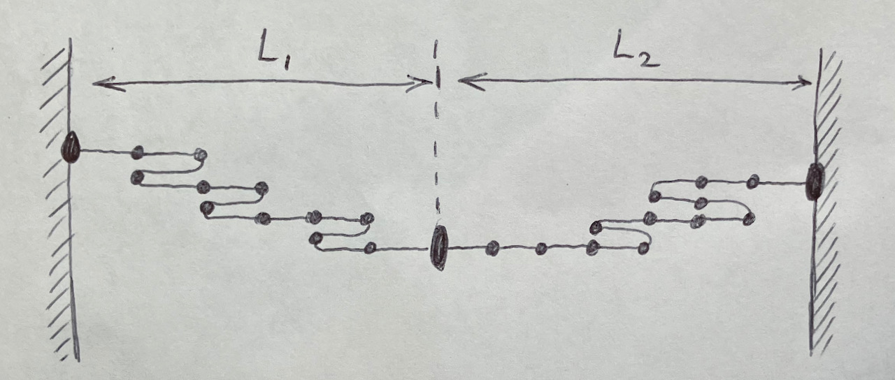 To see the connection between \(\tau\) and \(\frac{dS}{dL}\), I find it helpful to think about connecting two freely jointed chains of length \(L_1\) and \(L_2\). These freely joined chains share a thermal bath of temperature \(T\) as shown in the figure below. The total length, \(L_1 + L_2\) is fixed. The individual lengths, \(L_1\) and \(L_2\), will adjust until \(\tau_1=\tau_2\). The equilibrium point occurs when total entropy, \(S_1+S_2\), is maximized. i.e. \(\frac{dS_1}{dL_1} = \frac{dS_2}{dL_2}\). This is equivalent to saying \(\tau \propto \frac{dS}{dL} \).