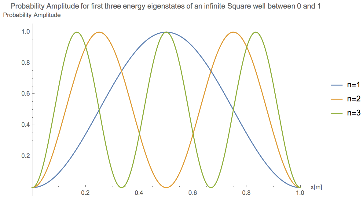 I notice that as \(n\) increases, the particle is more likely to be found near the edges of the well, away from the center. When I graph the probability amplitude for the first three eigenstates, these numbers seems reasonable.