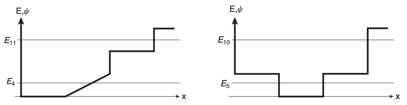 For each of the potential wells shown in the figure, make a qualitative sketch of the two energy eigenstate wave functions whose energies are indicated. For each energy state, identify the classically allowed and forbidden regions. Discuss the important qualitative features of each state.